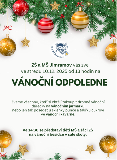 Srdečně zveme na (před) VÁNOČNÍ ODPOLEDNE do naší školy, které se uskuteční ve středu 10.12.2025 od 13 hodin v prostorách areálu ZŠ a MŠ Jimramov. Zveme všechny, kteří si chtějí zakoupit drobné vánoční dárečky na vánočním jarmarku anebo jen tak posedět u punče a cukroví ve vánoční kavárně.